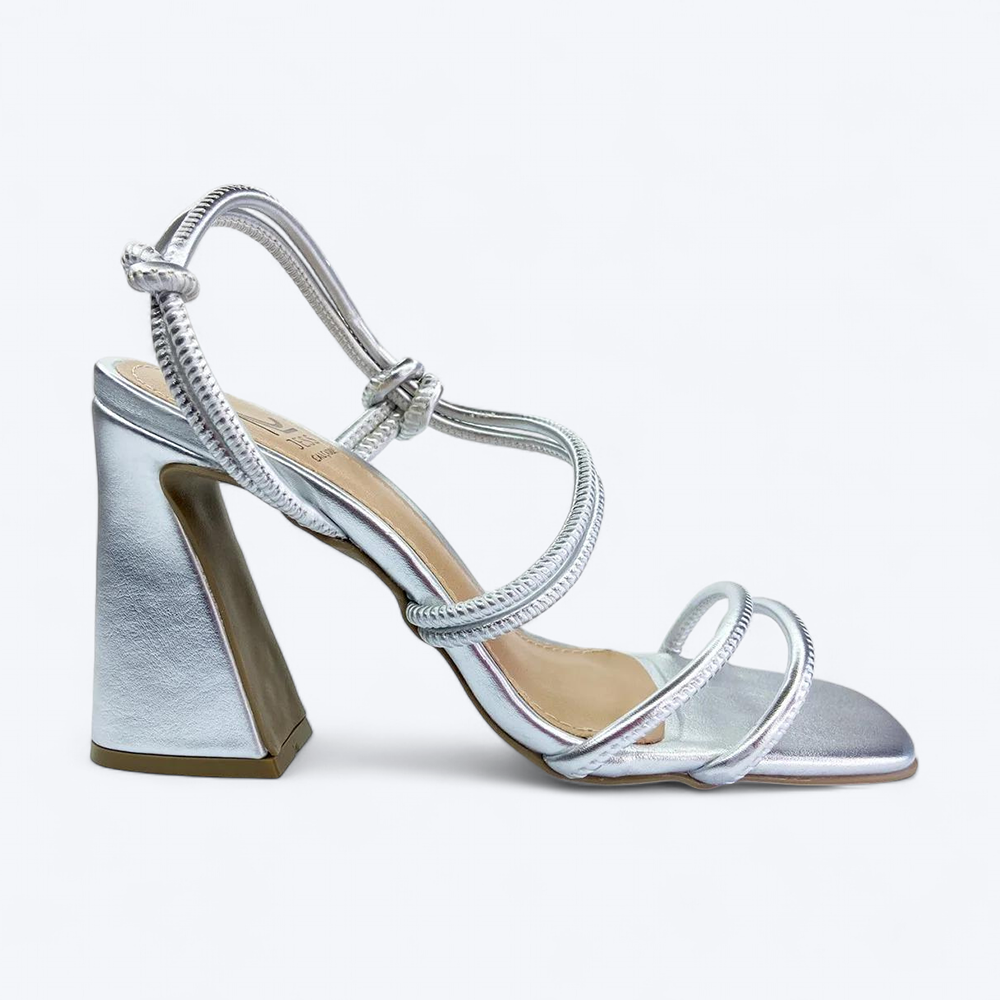 COMPRE JÁ A SUA SANDÁLIA JESS CALÇADOS SALTO VÍRGULA DETALHE EM COSTURA NÓ LATERAL PRATA