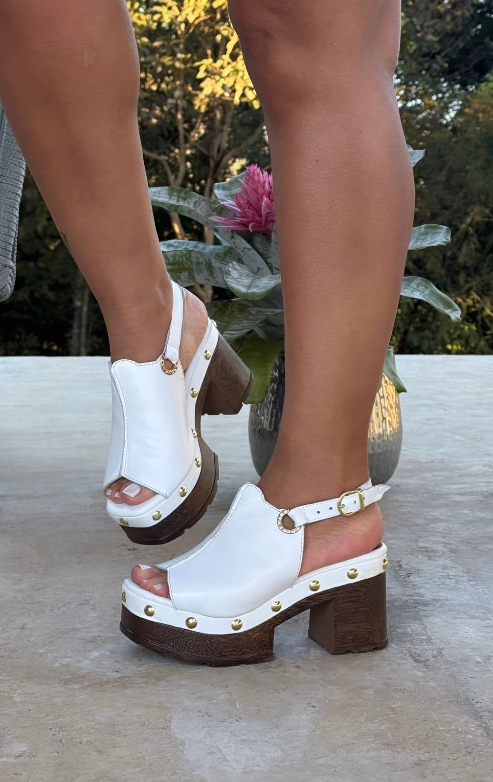 A Sandália Catarina é puro estilo e presença! Confeccionada em couro legítimo branco, ela traz o equilíbrio perfeito entre robustez e elegância. Seu design meia pata com salto bloco imponente garante altura com estabilidade, enquanto os detalhes metálicos aplicados ao redor do solado dão um toque moderno e sofisticado. O fechamento lateral com fivela permite ajuste ideal, proporcionando segurança e conforto ao caminhar.