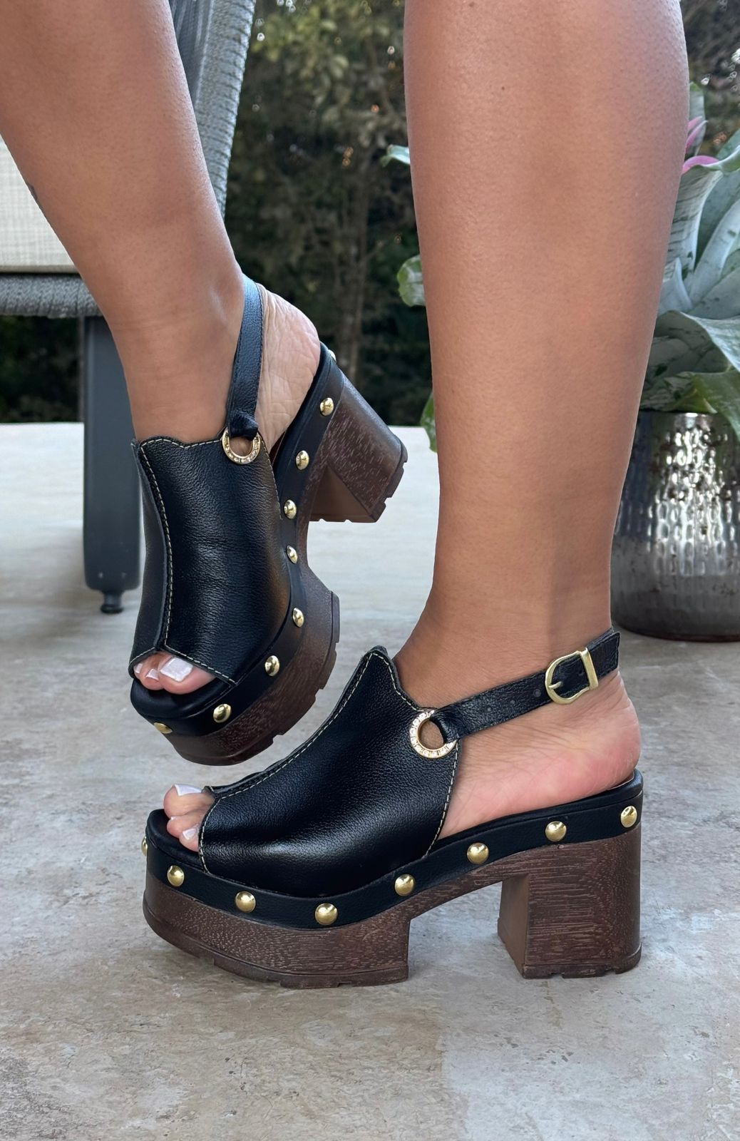 A Sandália Catarina é puro estilo e presença! Confeccionada em couro legítimo preto, ela traz o equilíbrio perfeito entre robustez e elegância. Seu design meia pata com salto bloco imponente garante altura com estabilidade, enquanto os detalhes metálicos aplicados ao redor do solado dão um toque moderno e sofisticado. O fechamento lateral com fivela permite ajuste ideal, proporcionando segurança e conforto ao caminhar.