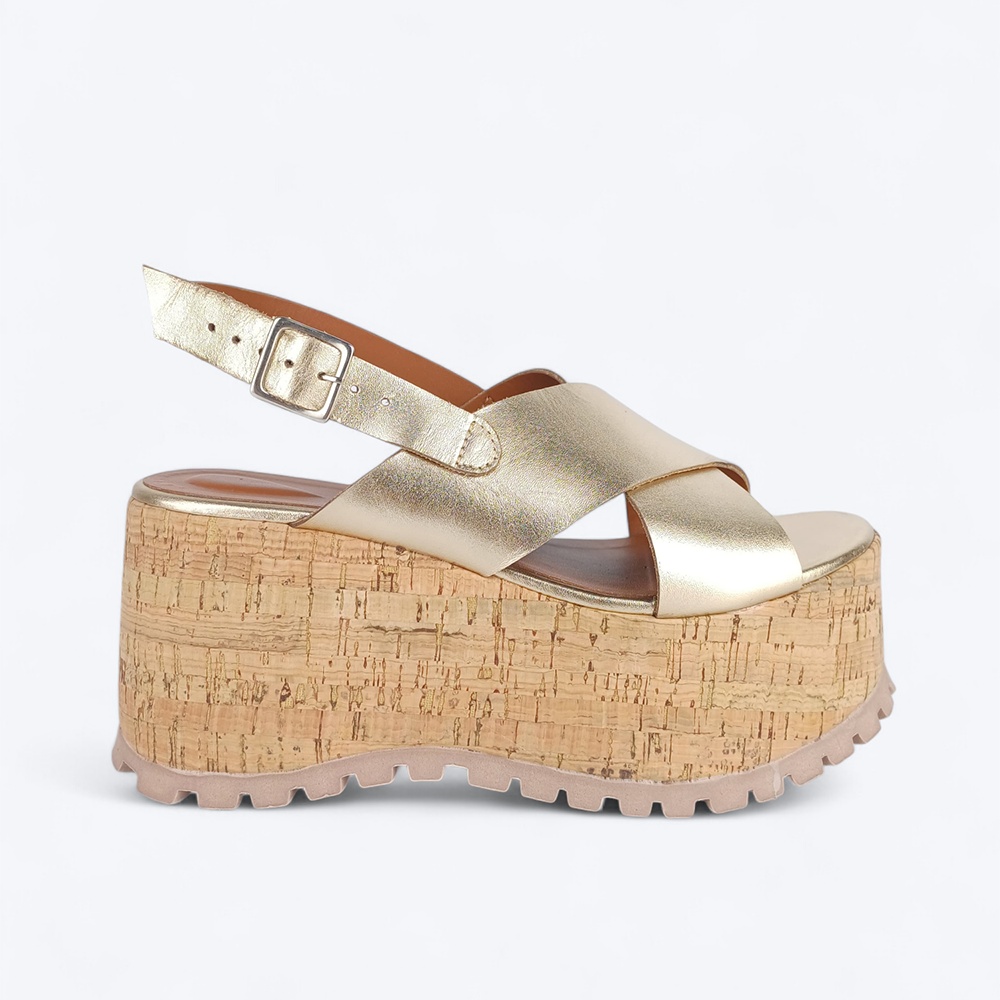 COMPRE JÁ A SUA SANDÁLIA PLATAFORMA THAÍS TIRAS CRUZADAS EM X EM COURO DOURADO