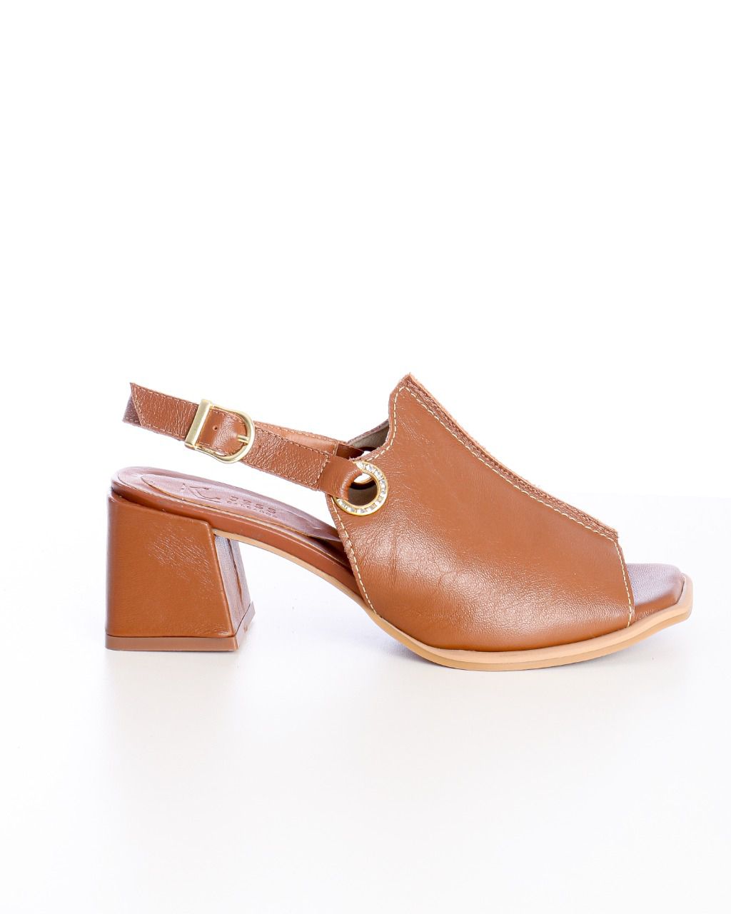 COMPRE JÁ A SUA SANDÁLIA SALTO BLOCO EM COURO CARAMELO DETALHE EM FIVELA